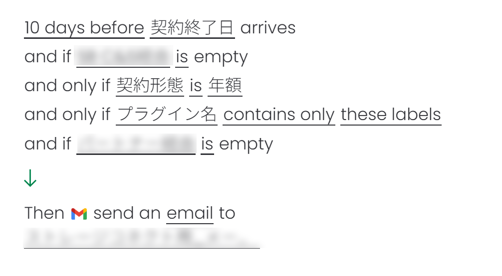 さらに契約案内では、契約開始日から満了日を自動算出し、件名や本文テンプレートも数式で生成。これにより、入力ミスや案内漏れを防ぎ、全社で統一されたフォーマットを保てています。